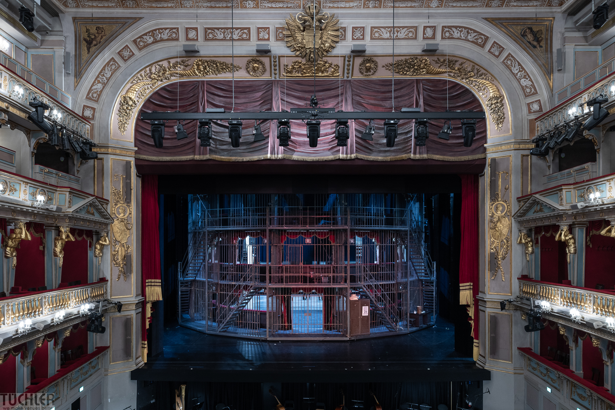 Die Lösung entstand in enger Zusammenarbeit zwischen TÜCHLER, dem Intendanten und der Bühnentechnik des Hauses direkt vor Ort. Schritt für Schritt wurde die ideale Zugseil-Kurve entwickelt – nicht rechnerisch am Schreibtisch, sondern durch gemeinsames Arbeiten im Raum. Dabei wurde der sichtbare Verlauf des Vorhangs immer wieder analysiert, Ringe neu gesetzt und Positionen angepasst, bis die Öffnungsbewegung ästhetisch, technisch und bühnenpraktisch optimal harmonierte. Hinzu kamen die spezifischen Rahmenbedingungen des Hauses: die Freigabe der Obertitelanzeige, der äußerst knappe Platz an den Bühnenseiten und das Fehlen vorhandener Seilrollen im Portal. Deren Positionen ergaben sich letztlich aus der entwickelten Zugkurve selbst.