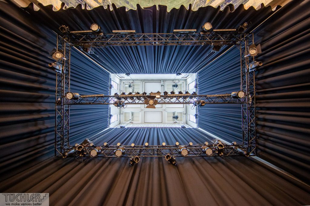 In the 22m high church tower, which is located directly above the stage, as well as in the area of the gallery in the area of the portal window, the strongly damping stage and acoustics office Lehar shows its strongly reverberation-reducing properties. In front of the arched glass window in the portal, the curtains are electrically opened and closed by TÜCHLER's UNIVERSAL RS 3P curtain drive on the TT2 curtain rail.